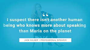 Maria: Don’t just learn to speak, learn the business of speaking. And don’t underestimate how much of your time will be spent finding and getting the bookings versus being on stage. So, the first step is to understand who books speakers, what they buy, and how to position yourself as the most relevant choice for their event. Professional speaking needs to be treated like a business, not a hobby.