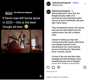 Nostalgia and tech blended into one. This Christmas ad from Google sees a reprisal of Macaulay Culkin as Kevin. Except this time, he uses Google Assistant to do everything for him. A familiar story with a modern twist.